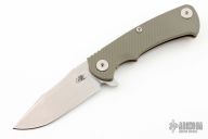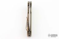 This Project X Flipper by Rick Hinderer Knives features a stonewashed blade, notched thumbrest and flipper, dual thumbstuds. The handle has a green G-10 scale, and a bronze stonewash titanium frame with matching clip. Nice lockup, seating, and detent. Comes with original box and extra hardware. Excellent condition.