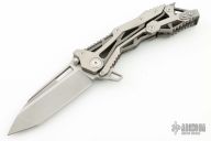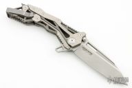 This QTR-11 from Quartermaster Knives features a stonewashed drop point tanto blade with dual thumb studs, notched thumb rest and flipper. The handle is comprised of satin finished and tumbled titanium, and stainless steel tip up clip. This knife is a G&G Hawk design. Comes with original box and papers, Has some light scratches, otherwise excellent condition. #71 of 300