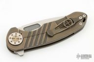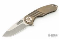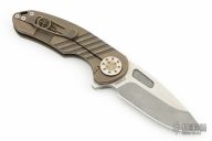 This F3 Medium by Curtiss Knives features a two tone stonewashed Magnacut blade with notched thumbrest and flipper. The handle has an anodized milled titanium frame over notched titanium backspacer, matching titanium tip up clip. Smooth and fast opening using a Caged Bearing System. Nice blade seating, detent and lock up. Includes a zippered case and original packaging.  Excellent Condition.