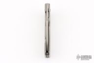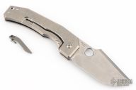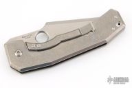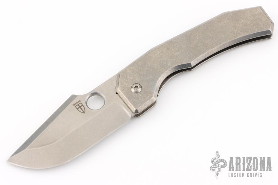 This Tyr Framelock has a tumble finished clip point blade with thumbhole. Handle has a stonewashed titanium frame and bead blast finished tip up clip. Nice detent, lockup and blade seating. Comes with maker's zipper case. The pocket clip is not attatched.  The screw to the pocket clip is not correct.  Excellent condition.