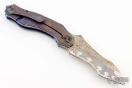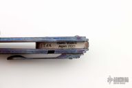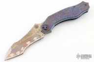 The Titan, by Glenn Waters, features an M390 wharncliffe recurve blade with a carbide edge. The handle is composed of titanium with a multi color carbide coated frame. Papers dated 2021 and a padded zippered case are included. Nice action, lock up and blade seating. Excellent Condition.