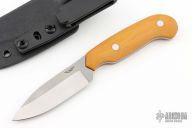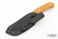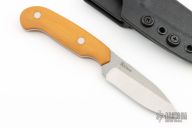 This Mombassa by Steve Woods and Ryan Wilson features a satin finished blade with stonewashed flats and a notched thumbrest, .105" blade stock and .972" blade depth, full tang construction. The handle has vintage linen micarta scales. Comes with a kydex sheath and a zippered case. Comes with COA dated May 2024. New from maker!