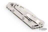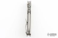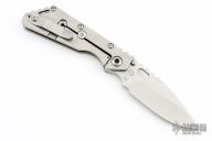 This Mick Strider Performance Series SMF framelock folder features a spear point 3/4 grind blade with thumbhole and notched thumbrest. The handle has a stonewashed titanium frame with titanium clip, tip up carry. Jimping on blade spine. Includes Hinderer "Lock Bar Stabilizer" for maximum reverse lock retention. Nice detent, lockup and blade seating. Excellent condition.