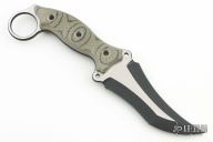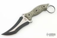 This Triceratops by the Busse features a black/satin finished blade with sharpened top edge, .189" blade stock, 1.799" blade depth, full tang construction with green/black G-10 scales with a ring at the butt. New from maker!