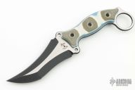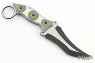 This Triceratops by the Busse features a black/satin finished blade with sharpened top edge, .189" blade stock, 1.799" blade depth, full tang construction with Nuclear green/white/blue G-10 scales with a ring at the butt. New from maker!