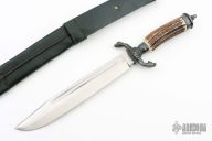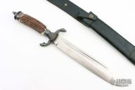 The hunting cutlass by Hubertus features a silver plated cross guard with the head of a dog and fox. The silver plated handle fittings are decorated with oak leaves, and the handle itself is genuine stag horn. The cutlass is 17.25" from end to end, with a 10" blade. The stainless steel blade is drop forged and given a satin finish. The black leather sheath provides a secure belt loop hanger. Excellent condition.