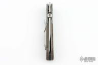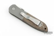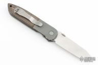 This Custom CQC-6 by Emerson features a chisel ground tanto blade with a satin finish, thumbdisc, and notched thumbrest. The handle has bead blasted titanium dovetailed bolsters and THIN titanium liners, green canvas micarta scales, black G-10 backspacer, and a tip up stainless steel clip. Comes with Emerson box and papers. Nice detent, lockup and blade seating. Early 2000s. Has some light scuffs, otherwise excellent condition.