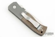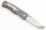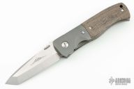 This Custom CQC-7 by Emerson Knives features a chisel ground satin finished tanto blade with notched thumbrest, and a thumbdisc. The handle has bead blasted and dovetailed titanium bolsters, green canvas micarta scales, bead blasted titanium liners, black G-10 backspacer, tip up stainless steel clip. Has some light scuffs, otherwise excellent condition. Early to mid 2000s. Comes with and Emerson box.