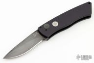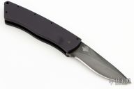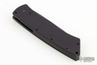 This Woodard/ Brend Whitewolf Auto has a black hand rub satin finished recurve blade with swedge. Handle is black anodized aluminum with black fiber backspacer and lanyard hole. Comes with a drawstring pouch. Decent action, has some light scuffs on the frame, excellent condition otherwise.
