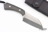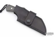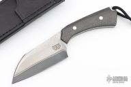 This Shredder by Tashi Bharucha is one of 4, two had rings at the butt, and two did not. This knife features a San Mai Damascus blade with .190" blade stock and 1.685" blade depth, full tang construction. The handle has carbon fiber scales with a lanyard hole at the butt. Comes with a black leather sheath. Excellent condition.