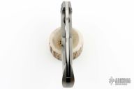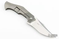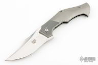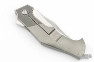 This Bowie Project Folder by Tashi Bharucha is one of about 15 made. It features a hand rub satin finished blade with flipper. The handle has a bead blasted titanium frame with laser engraved faux bolsters, Zirc pivot collars and backspacer. Rides on bearings, nice detent, lockup and blade seating. Comes with a zippered case and a brown leather belt sheath. Excellent condition.