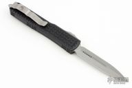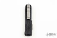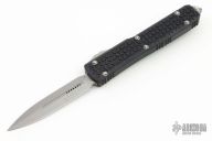 This Ultratech OTF automatic has a bead blasted double edge blade with a black anodized aluminum handle. Stainless steel clip. Glass breaker. Dated 06/2015 with a S/N of 56585. Comes with a boker zipper case. Has some light scuffs, and scratches, great condition otherwise.