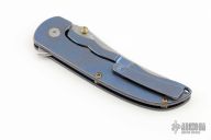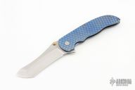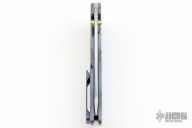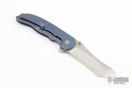 This Norseman (#3154) by John Grimsmo features a tumbled blade with dual anodized titanium thumb stud, notched thumb ramp and flipper. Stonewashed and anodized titanium frame with a Diamond pattern front scale and titanium screws. Matching tip up pocket clip. Very smooth action that requires no wrist movement. Nice detent, lockup and blade seating. Rides on ceramic bearings. Comes with original box and COA dated December 16, 2019. Excellent Condition.