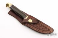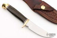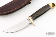 This custom skinner by Harvey Draper features a mirror polished blade with .170" blade stock and 1.016" blade depth, hidden tang construction. The handle has a brass guard and butt, black canvas micarta grip with black/aluminum spacers. Comes with a hand tooled brown leather sheath. Has a few very light scratches, otherwise excellent condition.