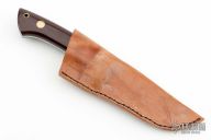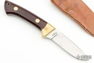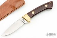 This knife by Explorer features a satin finished blade with .149" blade stock and .972" blade depth, full tang construction. The handle has brass bolsters, brown linen micarta scales. Comes with a brown leather sheath. Has some light scratches, otherwise excellent condition.