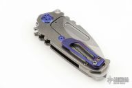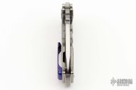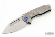 This Micro Praetorian from Medford Knife and Tool features a satin finished drop point blade with notched thumbrest and fullers. The handle has a stonewashed titanium frame with an anodized titanium tip up pocket clip. Stainless steel backspacer doubles as a glass breaker. Comes with original hard case and papers dated June 20, 2023. Excellent condition.