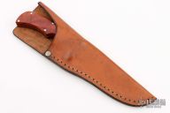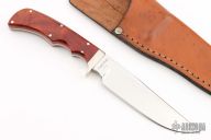 This knife by Jerry McAlpin features a satin finished blade with fileworked thumbrest, .195" blade stock and 1.204" blade depth, full tapered tang construction. The handle has a nickel silver guard with red maple scales. Comes with a brown leather sheath. Excellent condition.