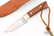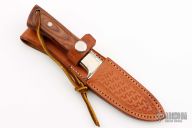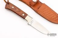 This knife by Sharp features a satin finished blade with .142" blade stock and 1.007" blade depth, full tang construction. The handle has nickel silver bolsters, laminated wood scales, lanyard hole. Comes with a hand tooled brown leather sheath. Excellent condition.