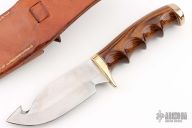 This knife by Perry Elder features a satin finished blade with guthook, .135" blade stock and 1.503" blade depth, hidden tang construction. The handle has a brass guard and butt with pakawood grip and black/white spacers. Coems with a brown leather sheath. Excellent condition.
