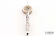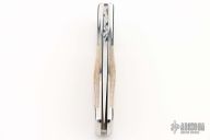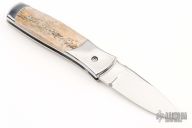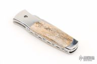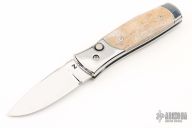 This side opening automatic from Z Custom Knives features a mirror polished drop point blade with a fileworked thumbrest. The handle features a mirror polished stainless steel frame with bone inlays, bone inlaid button, and a fileworked backspring. Comes with zipper case. Has a couple light scratches, excellent condition otherwise.