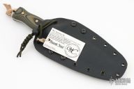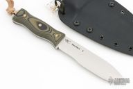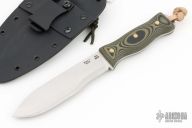 This Master Woodsman Model 1 by William Collins features a satin finished blade with .164" blade stock and 1.470" blade depth, full tang construction. The handle has G10 scales and brass pins, lanyard hole at the butt. Comes with a kydex sheath. Excellent condition.