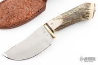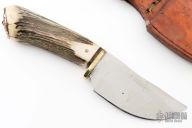 This knife by Robert (Bob) J Shearer features a polished blade with .180" blade stock and 1.831" blade depth, hidden tang construction. The handle has a brass guard and brass flower butt with a stag grip. Comes with a brown leather sheath. This one is marked "BS". Has some oxidation spots on the blade, has a couple scratches, otherwise good condition.