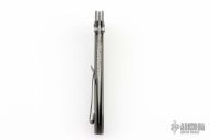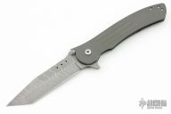 This flipper by John Kubasek features a stainless Damascus tanto blade with fileworked spine, notched thumbrest and flipper. The handle has a bead blasted titanium frame, bead blasted titanium tip up clip, black G-10 backspacer. Nice detent, lockup, action and blade seating. Comes with a zippered case. Excellent condition.