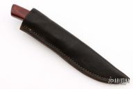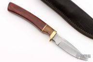 This knife by Herb Derr features a satin finished blade with .132" blade stock and .777" blade depth, hidden tang construction. The handle has a brass guard, dymondwood grip with brass and wood spacers. Comes with a brown leather sheath. Excellent condition.