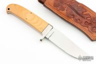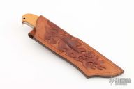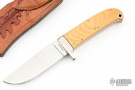 This hunter by Al Faulkner features a mirror polished blade with .184" blade stock and 1.119" blade depth, full tang construction. The handle has a nickel silver guard with Westinghouse paper micarta scales with red liners and nickel silver pins. Comes with a hand tooled brown leather sheath. Has a couple small pitted spots, has a few light scratches, otherwise good condition.