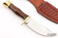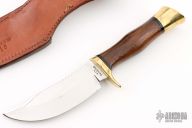 This knife by Browning Knives features a polished blade with notched thumbrest, .175" blade stock and 1.271" blade depth, hidden tang construction. The handle has a brass guard and butt, rosewood grip with black spacers. Comes with a hand tooled brown leather sheath. Has some light scratches, otherwise excellent condition.