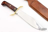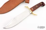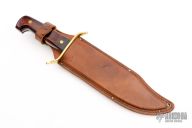 This W49 Bowie by Western Cutlery features a mirror polished blade with a false top edge, .170" blade stock and 2.124" blade depth, full tang construction. The handle has a brass s-guard, dymondwood scales with brass pins. Comes with a brown leather sheath. Has some scratches and light pitting, otherwise good condition.