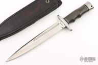 This Fighter by Jim Erikssen features a satin finished blade with fullers and sharpened top edge, .257" blade stock and 1.237" blade depth, hidden tang construction. The handle has a stainless steel guard and butt, black linen micarta grip, black/stainless steel spacers. Comes with a black leather sheath. #10 on the blade. Has a couple light scratches, otherwise excellent condition.