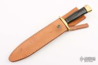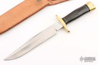 This Fighter by Jim Erikssen features a satin finished blade with a nearly sharpened top edge, .239" blade stock and 1.211" blade depth, hidden tang construction. The handle has a brass guard and butt, black linen micarta grip, black/brass spacers. Comes with a brown leather sheath, but there is no snap on the keeper. #19 on the blade. Excellent condition.