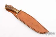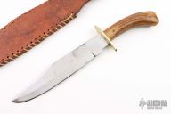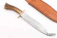 This bowie features a satin finished blade with .174" blade stock and 1.758" blade depth, hidden tang construction. The handle has a bras guard and butt, stag grip. Comes with a brown leather sheath. Has some oxidation and scratches, has been resharpened, otherwise good user condition.