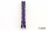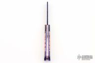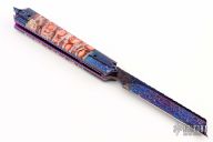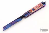 This Custom Guillotine Razor side-opening automatic by Rainy Vallotton features a hot salt blued Cheetah Damascus blade with fileworked spine. The handle has Cheetah Damascus bolsters and butt, red mammoth molar scales, matching Damascus push button, fileworked stainless steel backspacer, fileworked and anodized titanium liners. Strong and fast leaf spring action. Nice function. Solid lockup and nice blade seating. Beautiful materials. Comes with Maker's zipper case, and COA. Excellent condition.