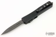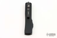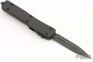 This UTX-70 OTF automatic by Microtech features a D/E Damascus blade with a standard edges. The handle has a black aluminum frame with carbon fiber top, black stainless steel tip down clip, black ringed hardware. Serial number 291 and dated 10/2021. Comes with original box and papers. Excellent condition.