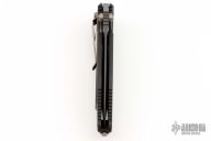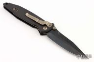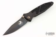 This Signature Series Socom Elite manual linerlock folder by Microtech Knives has a black DLC blade with notched thumbrest and dual thumbstuds. Has a black aluminum handle with non-slip inlays, tip down blasted stainless steel clip. Serial number 039 and dated 03/2018. Comes with original box and papers. Excellent condition.