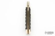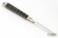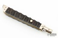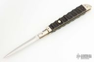 This Kudu Horn Picklock from Lee C. Reynolds features a mirror polished dagger style blade with false top edge. The handle is comprised of nickel silver bolsters and pommel with kudu horn scales over brass liners and stainless steel backspacer. Scuffs on bolsters and pommel but otherwise good condition. Fast, strong opening.