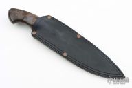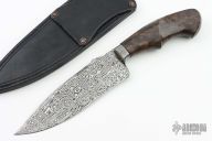 This Knife by Jan Hafinec features a Damascus blade with .215" blade stock and 1.925" blade depth, hidden tang construction. The handle has an integral Damascus guard with a burl wood grip. Comes with a black leather sheath with copper rivets. New from maker.