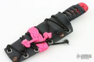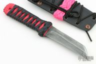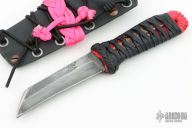 This KubiKiri by Aaroneous Blades feautres a hawkbill blade with .123" blade stock and 1.033" blade depth, hidden tang construction. The handle has black cord wrap over pink cord wrap with a copper lightning bolt menuki. Comes with a kydex sheath with pink cord wrap, and COA. Has some light scratches, otherwise excellent condition.