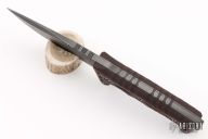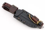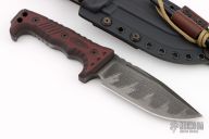 This Custom M-8 Compact by Miller Bros Blades features a clip point blade with notched thumbrest made from Z-Wear PM steel, .278" blade stock 1.657" blade depth, full tang construction. The handle has red/black G-10 scales with notched tang top and bottom. lanyard holes at the butt. Comes with a kydex/leather sheath. New condition. Comes with COA dated 2024