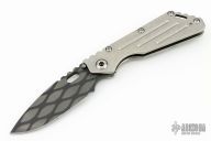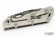 This Mick Strider Performance Series SMF framelock folder features a WG Pattern blade with thumbhole and notched thumbrest. The handle has a stonewashed titanium frame with titanium clip, tip up carry. Jimping on blade spine. Includes Hinderer "Lock Bar Stabilizer" for maximum reverse lock retention. Nice detent, lockup and blade seating. New condition.