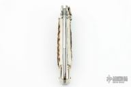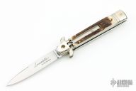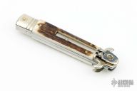 This Leverletto Lever Lock Auto has a mirror polished stainless steel spear point blade. The handle has stag scales, fluted nickel silver front and rear bolsters, stainless steel liners and back spacer, and nickel silver lock release button. Has a couple light scratches, otherwise excellent condition.
