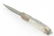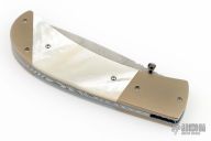This knife features a Damascus drop point blade with a single thumbstud with inlay. The handle has anodized bolsters, mother-of-pearl scales, anodized titanium liners with a Damascus backspacer. Nice lockup and blade seating. Excellent Condition.  We believe this knife was made by Bernie Michelle but are not entirely sure.
