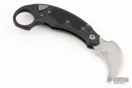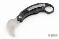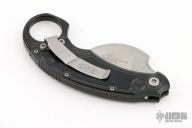 This Iconic Auto has a black handle and a stonewashed blade. Designed after the Iconic Karambit fixed blade, the Iconic Auto, made in collaboration with Bastinelli Creations, is a must-have innovative tactical knife. Most automatic knives open from a push button near the pivot, but the button on the Iconic is near the finger hole. Once you've de-activated the safety, you can open the blade with a button near the finger hole. Features: Premium stainless steel blade is tough and will hold it's edge. Unique push button action allows for a reverse grip during deployment. Finger hole allows for a secure and unbreakable grip. Comes with original box and papers. S/N 392 and dated 03/2020. Excellent condition. Comes with a Dragoncut pouch and velcro patch.