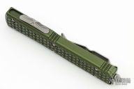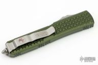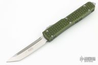 This Ultratech OTF automatic features a T/E satin tanto blade with a standard edge. Olive drab tri-grip aluminum handle with stainless steel clip. Glass breaker. Serial number 64340 and dated 03/2016. Comes with original box. Has some light scuffs and scratches, great condition otherwise.