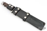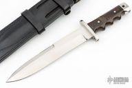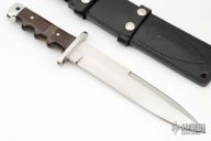 This Prototype Fighter by Robert Rippy features a hand rub satin finished spear point blade with a sharpened top edge, .252" blade stock and 1.521" blade depth, full tang construction. The handle has a stainless steel guard and butt with rag canvas micarta scales, lanyard hole at the butt. Comes with a black leather sheath. Has some light scratches, otherwise excellent condition. "0" on the blade.