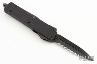 This Combat Troodon OTF automatic by Microtech knives features a double edged, DLC finished reverse full serrated blade. The handle has a DLC frag pattern aluminum handle with black hardware, tip down carry. Glass breaker. Comes with original box and papers. Excellent condition. s/n 336 dated 07/2021.