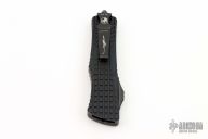 The Combat Troodon is a precision-made, out-the-front tactical knife. It is 25% larger than the flagship, the Troodon. It brings the slender handle, contoured shape, radical design elements, and a sophisticated internal mechanism that improves operational functionality and reliability to a larger scale. The Combat Troodon is designed for a broad spectrum of utility and close quarter combat applications. Has a fluted DLC standard tanto blade. Black frag pattern aluminum handle with black hardware, tip down stainless steel clip and nickel boron internals. Comes with original box. Has some minor wear on the edges of the clip, otherwise excellent condition. Dated 05/2020 and S/N 042.