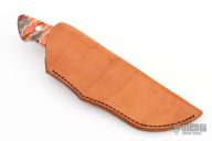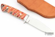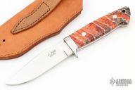 This knife by Chad Nell features a mirror polish drop point blade, full tapered tang construction, .150" blade stock and 1.104" blade depth. The handle has a mirror polished 416 stainless steel guard and mammoth tooth scales with red liners, lanyard hole. Comes with a brown leather sheath. Excellent condition.